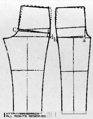 其體型特征是腹部向前挺,臀部相對(duì)較平緩,腳跟后傾。著裝后出現(xiàn)在褲子上的弊病是褲立襠前短后長,腹部略緊,褲角則前空后貼。處理的方法是(1)將前片橫襠線ab剪開,向上拉開a點(diǎn),使立襠深增加,彌補(bǔ)前襠短的弊玻(2)將后片臀圍線c點(diǎn)與d點(diǎn)連線,向下疊合c點(diǎn),使后翹降低,修正后襠長的弊病(見圖一)。與后傾體體型相反的體型是前傾體體型,其著裝后出現(xiàn)在褲子上的弊病及處理方法都與后傾體體型相反。只要掌握后傾體體型的處理方法,那前傾體體型的處理方法也就迎刃而解了。