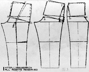其體型特征是愎、臀及腰下部都顯著突出且豐滿,腰部中心軸向后倒,但整個(gè)下體前后平衡。著裝后出現(xiàn)在褲子上的弊病是褲子上襠短,前l(fā)-]襟起斜綹,后襠縫下墜。處理的方法是(I)先將前片臀圍線ab剪開,再將bc連線剪開,沿a點(diǎn)向上拉開,加大臀高線以上的部位。(2)將后片臀圍線d與e點(diǎn)(橫襠線至臀圍線下3分之1處)連線剪開,再將ef連線剪開,沿d點(diǎn)向上拉開,加大臀圍量(見圖三)。